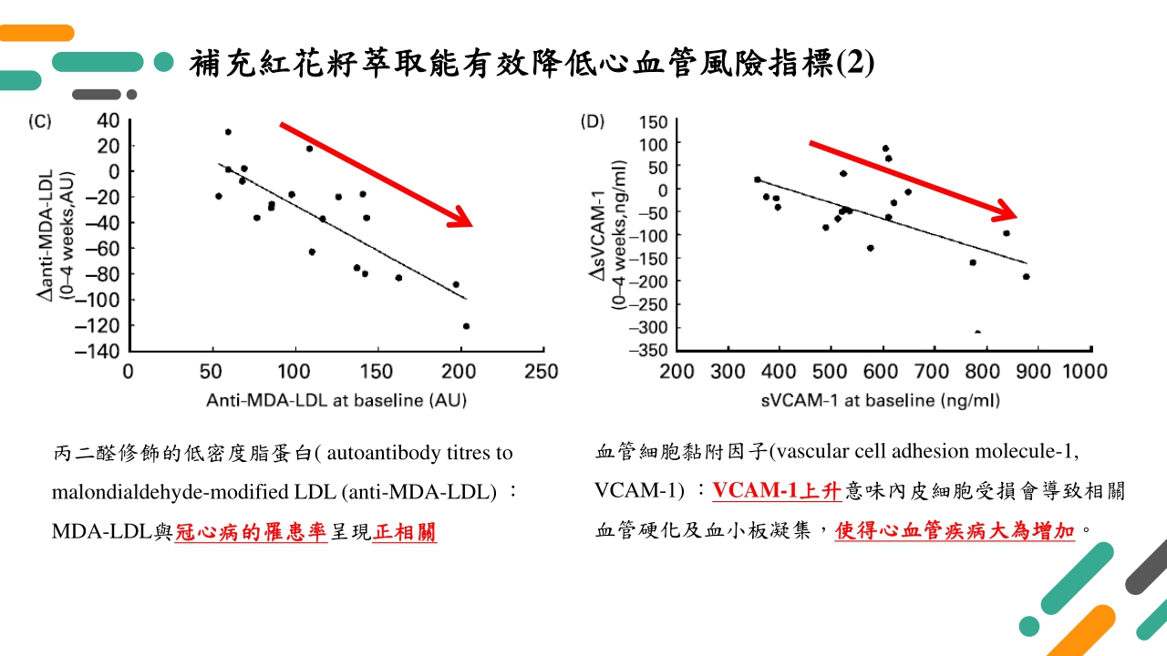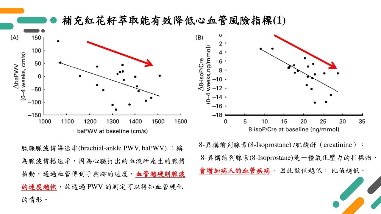 根據最新公布的國人十大死因中,第二名仍然是心臟(血管)疾病,在新聞中有時都能看到許多公眾人物因為心血管疾病不幸離世,因此如何能降低心血管疾病風險就成為了首要目標,根據研究指出,紅花籽萃取能有效降低諸多心血管風險指標如肱踝脈波傳導速率、8-異構前列腺素/肌酸酐比值、丙二醛修飾的低密度脂蛋白、血管細胞黏附因子等,對於這些指標的降低都能有效減少心臟(血管)疾病罹患率的風險,因此除了生活型態的改變,從營養素著手也是非常重要的一環!