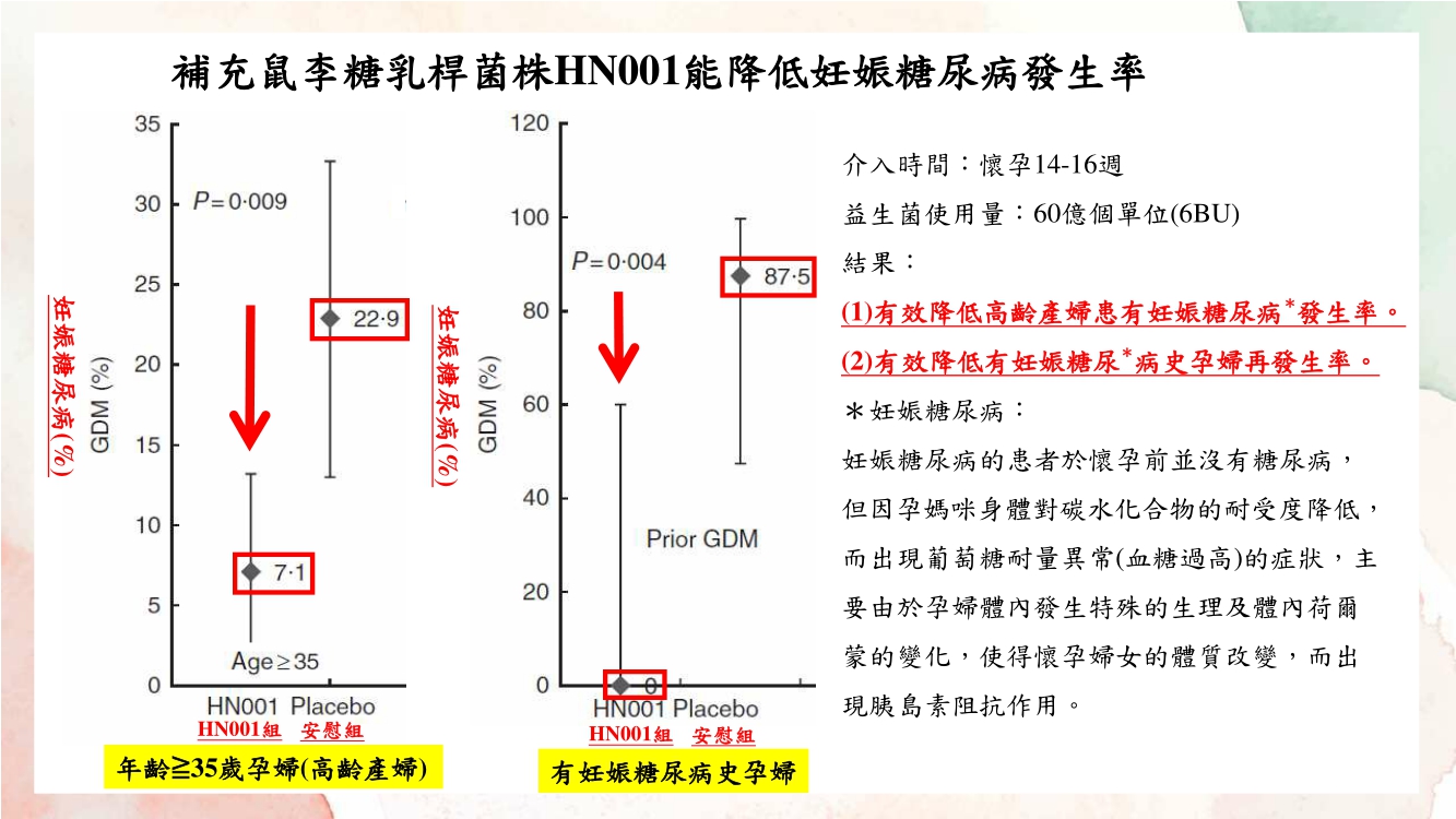 妊娠糖尿病是指患者於懷孕前並沒有糖尿病,但因孕媽咪身體對碳水化合物的耐受度降低,而出現葡萄糖耐量異常(血糖過高)的症狀,主要由於孕婦體內發生特殊的生理及體內荷爾蒙的變化,使得懷孕婦女的體質改變,而出現胰島素阻抗作用。根據2017年紐西蘭發表在《英國營養學雜誌》期刊研究指出,補充鼠李糖乳桿菌株HN001能(1)有效降低高齡產婦患有妊娠糖尿病發生率,以及(2)有效降低有妊娠糖尿病史孕婦再發生率,且因此對於高齡產婦或是有妊娠糖尿病史的孕婦可說是必備益生菌株之一!