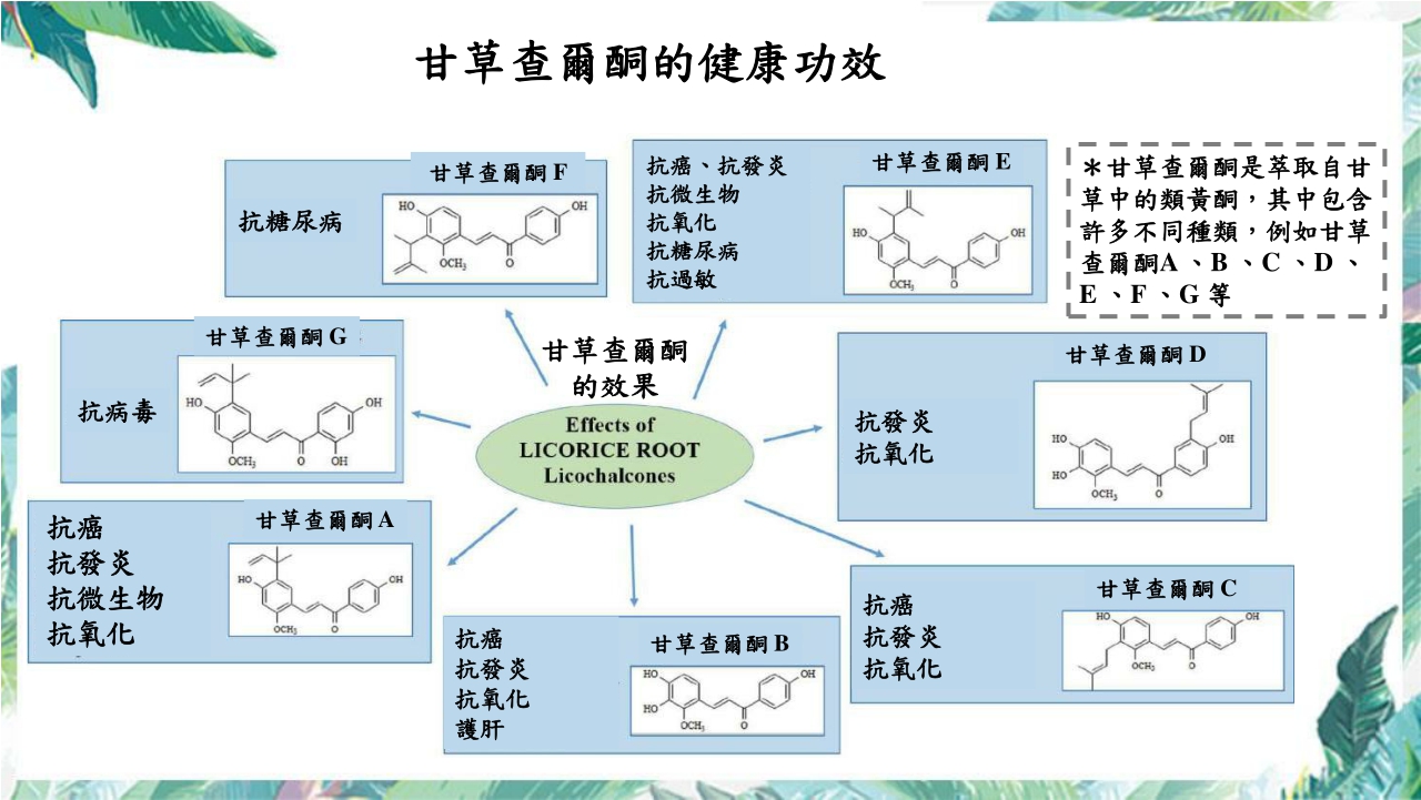 甘草以廣泛運用在許多醫療用途上,無論是食品或是藥品都可以看到甘草成分的存在,而甘草之所以能有諸多功效的原因就在含有許多不同種類的類黃酮-甘草查爾酮!甘草查爾酮有不同種類,大致上有甘草查爾酮A至甘草查爾酮G,各種不同的種類有不同的功效,例如抗氧化、抗發炎、抗病毒等,因此可以得知適當補充甘草可以說是受益良多!