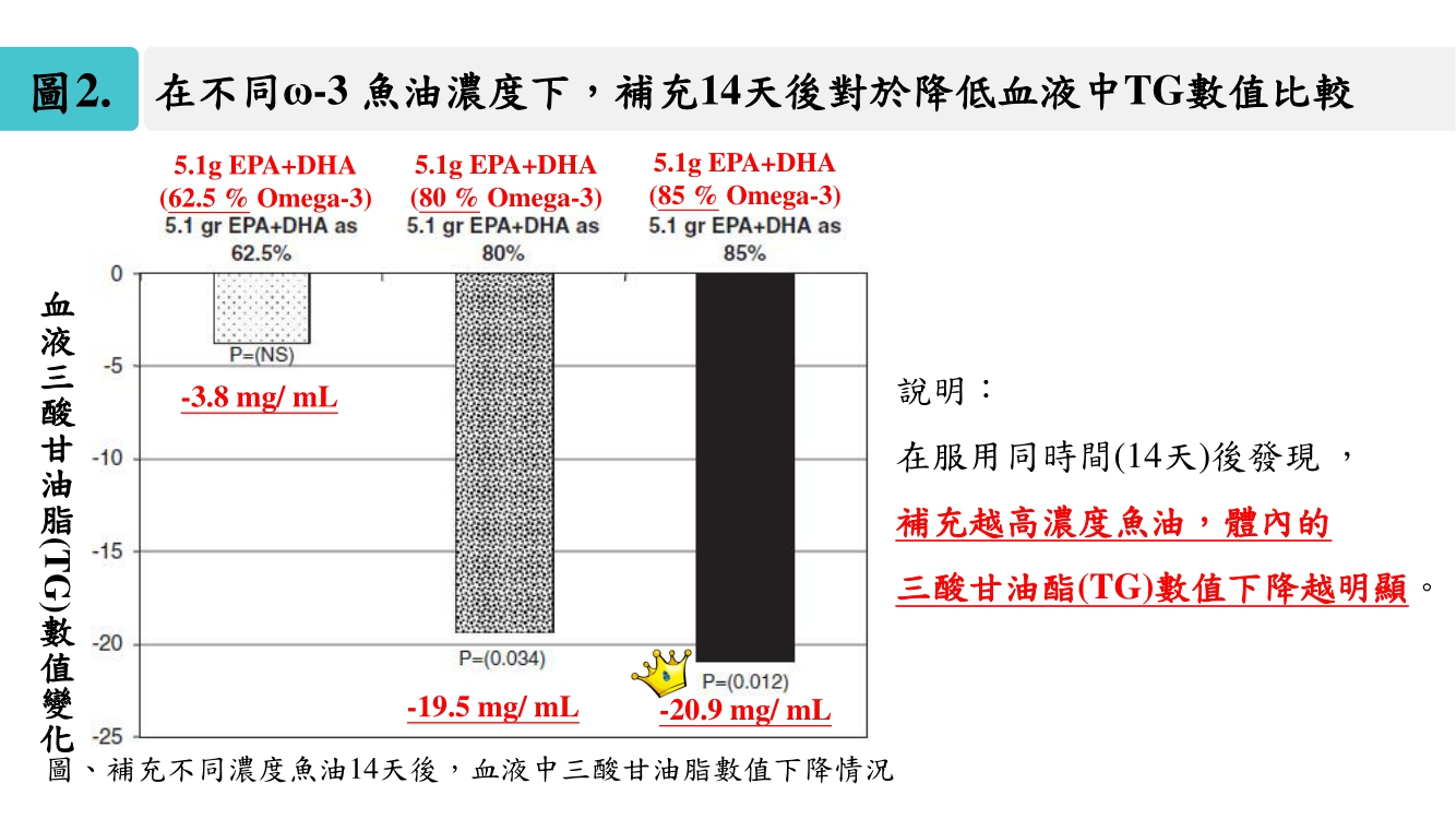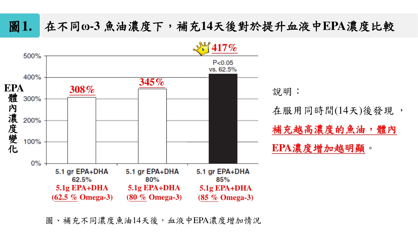 富含Omega-3的魚油一直是國人選購的熱門保健品之一,其對於身體的好處也是廣為人知,例如降血脂、抗發炎、調節免疫等等,而近年來隨著提煉魚油技術越來越進步,能夠萃取出的魚油濃度(Omega-3濃度)也是越來越高,而目前能夠萃取出的最高Omega-3濃度為90% EPA,根據一篇挪威科學家的研究證實,在食用一段時間(14天) 後,發現補充「濃度越高」的魚油,對於提升人體內血液中EPA濃度以及降低血液中三酸甘油脂數值都比濃度低的魚油效果更好,所以建議平常選擇魚油保健品時要注意「魚油濃度」,才不會花了錢卻沒有達到預期的效果喔!