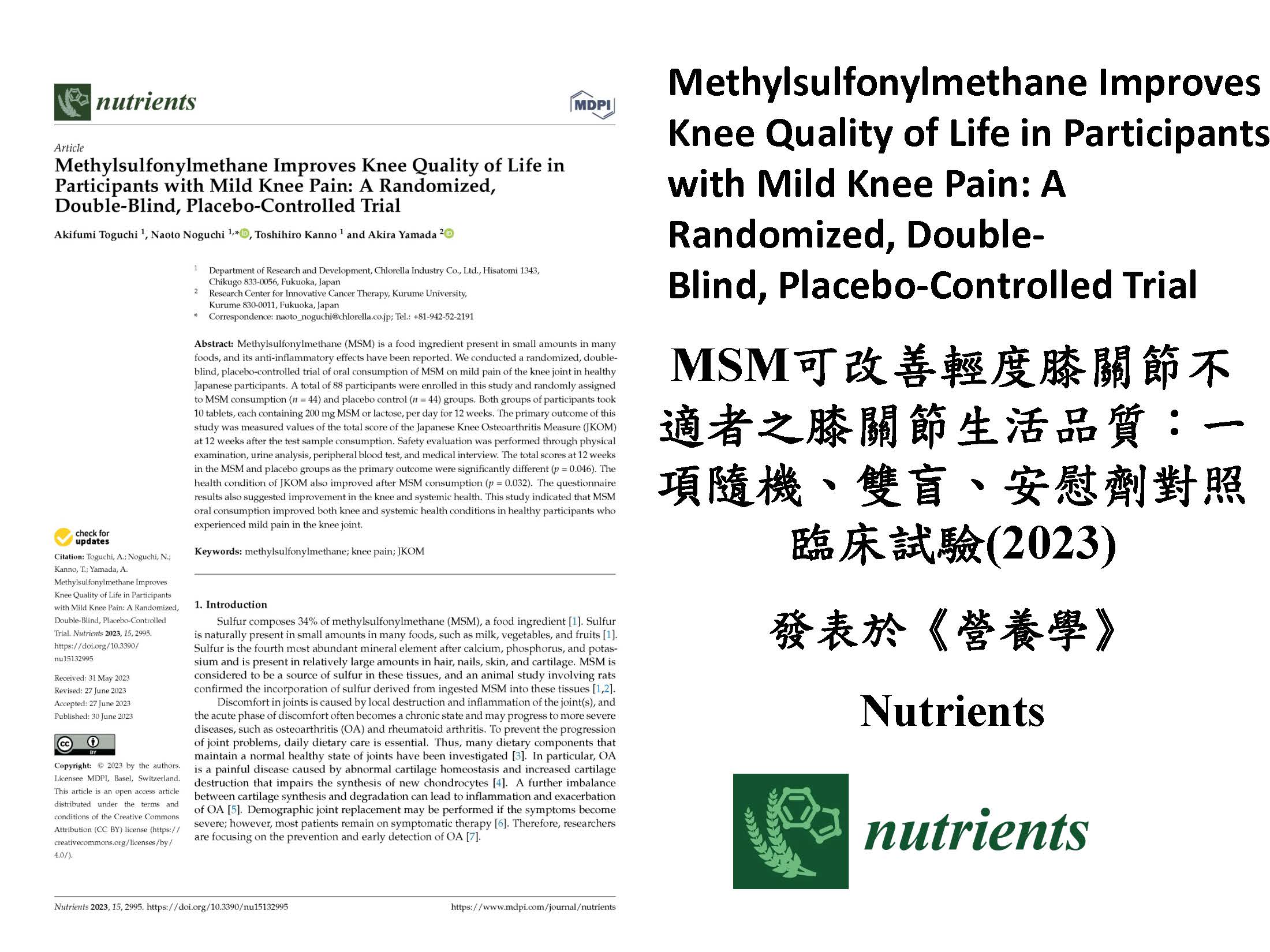 MSM可以改善輕度膝關節不適者之膝關節生活品質